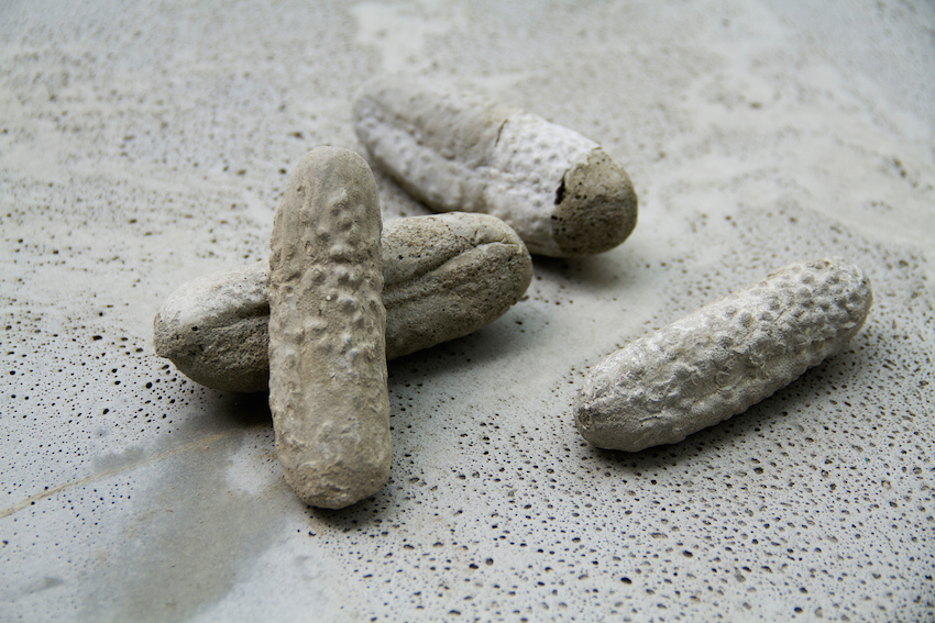 Série de moulages de cornichons en béton, tirage unique dimensions variables entre 12 et 4 cm