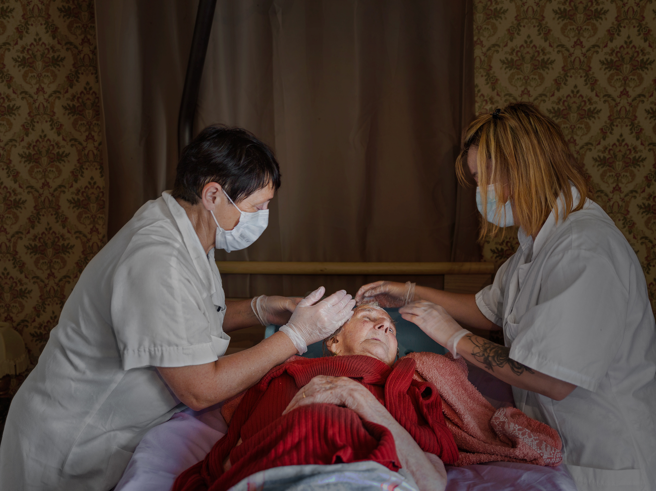 olivia gay La toilette au lit d’Amélie, Nogent-le-Rotrou, été 2022, série À domicile, 2022, Tirage 15 x 21 cm, impression pigmentaire.
