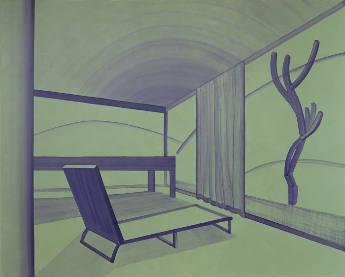 La première version du Saloon (en forêt) est plus parlante encore, l’arrière-plan particulièrement sombre et tourmenté du petit format venant comme engloutir la sage ordonnance de l’édifice – la construction, si rigoureuse soit-elle, paraît en effet bien gracile en regard du tumulte visuel de la surface qui la domine. Guillaume Mary met continuellement à mal l’intégrité géométrique des bâtiments qu’il représente, venant jouer des manques, des disproportions d’échelle, de placements d’ombres comme de perspectives erronées – tout pour venir contrarier l’appréhension du volume posé sur la toile. C’est également notable dans l’importance qu’il accorde à indiquer l’artificialité des seuils – le dessin outré de la double porte du Saloon dont les battants se referment sur une inexplicable lumière, ou l’entrée de la Façade d’atelier dont l’embrasure de la porte ne révèle qu’une improbable encoignure, bouchant la vue. Ici, en définitive, l’ouverture ne donne guère plus à voir – derrière l’envers du décor, rien. L’espace dépeint demeure énigmatique, c’est-à-dire aussi un puissant espace de projection.